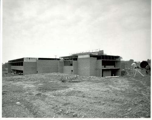 DescriptionBlack and white photograph of the Municipal building under construction; The photograph is taken from the back of the building facing Northwest; The exterior of the building is red brick; A group of workers can be seen on the proper right on the building; A second group of two workers can be seen on the proper right; One of the two workers is holding a shovel; Scaffolding can be seen on the top of the building as more brickwork is to be done