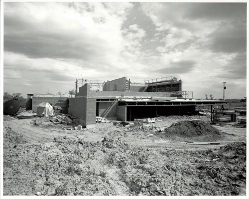 DescriptionBlack and white photograph of the Municipal Building under construction; Material and scaffolding can be seen throughout the photo surrounding the building; two workers can be seen on the far proper left; Part of a large tanks can be seen on the proper right