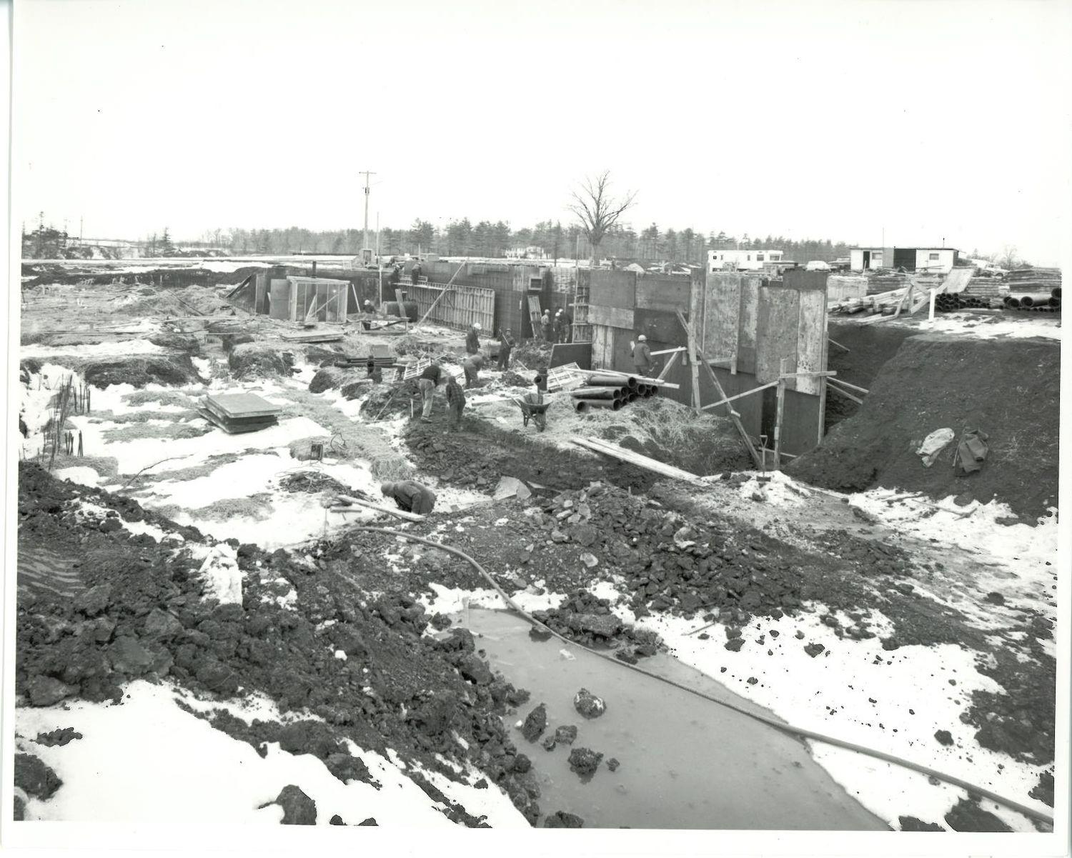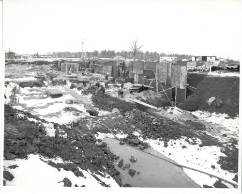 DescriptionBlack and white photograph of the early construction of the Municipal Building; in the center workers can be seen installing the foundation frame work for the building; in the distance on the proper left the construction office can be seen; Part of the ground is snow covered