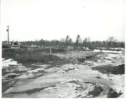 DescriptionBlack and white photograph of the early construction of the Municipal Building; In the far center is the workers installing the wood frame work for the building foundations; On the far proper right is a parked pickup truck and the construction offices; The ground is partially covered in snow and ice