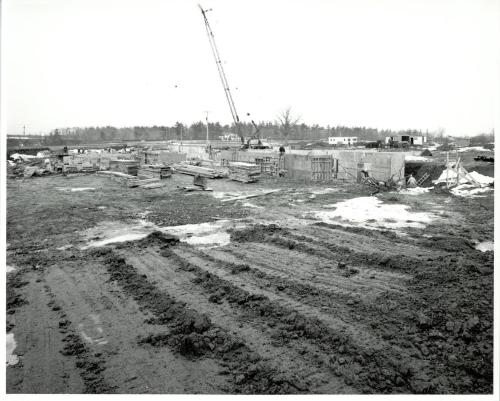 DescriptionBlack and white photograph of the early construction of the Municipal Building; Workers can be seen working on the foundations for the building; There are piles of wood to the proper right of the foundations; In the center a crane can be seen; On the proper left workers can be seen standing in front of the construction site office; The ground is partially snow and ice covered