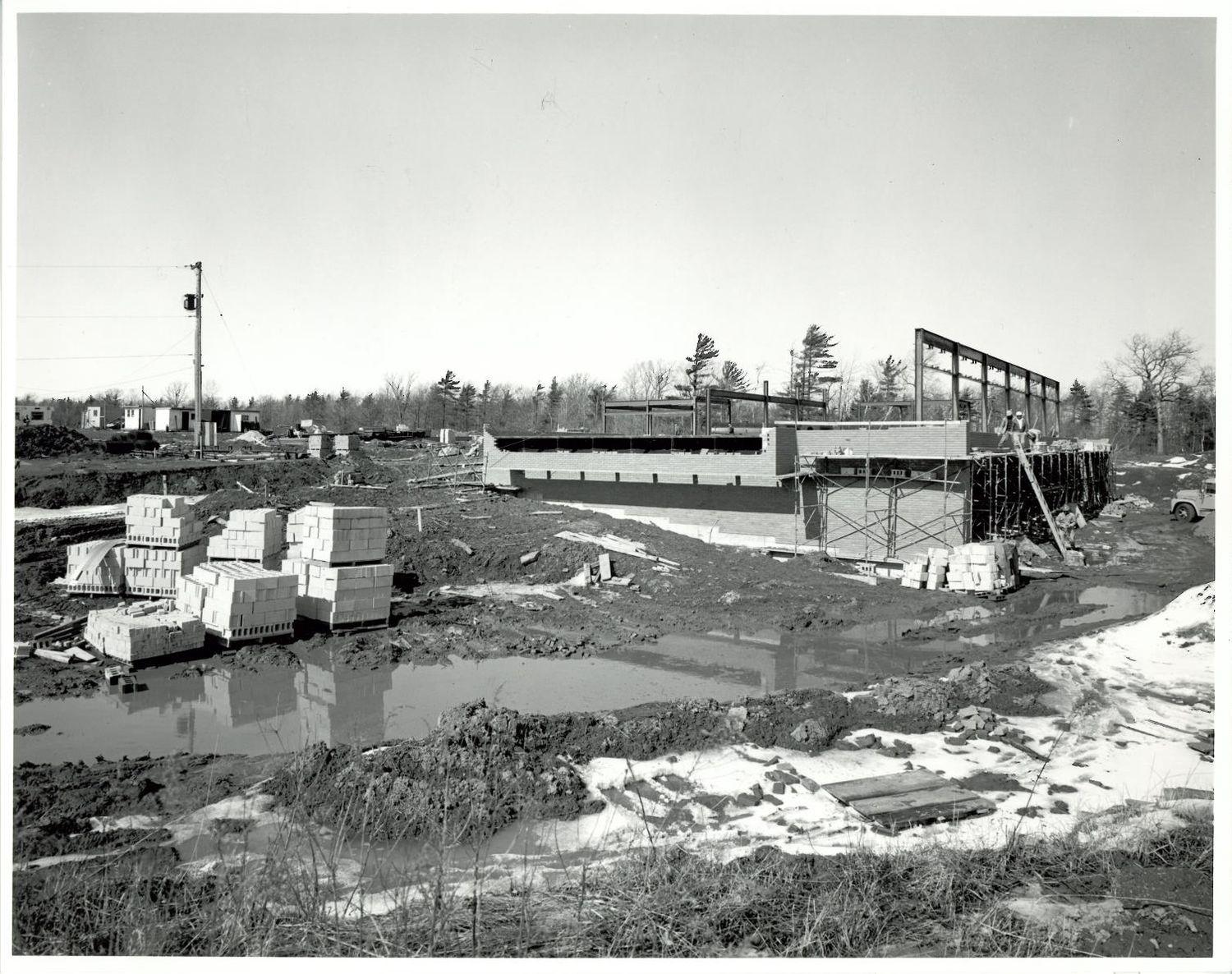 DescriptionBlack and white photograph of the early construction of the Municipal Building; Workers are working on the second level of the building; The steel frame work for the building can be seen on the second level; On the proper right there are 5 piles of cinderblocks; There is other building material around the construction site; On the far proper right the construction office building can be seen