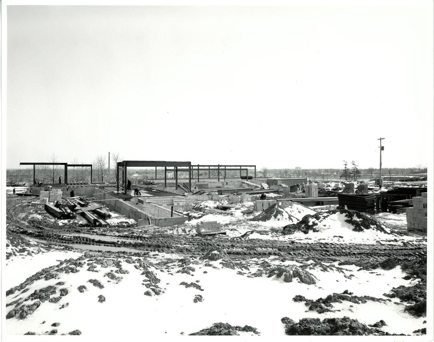 DescriptionBlack and white photograph of the Municipal Building being constructed; Workers can be seen working on the second level of the building; surrounding the site are various building materials; the ground is partially covered in snow and ice