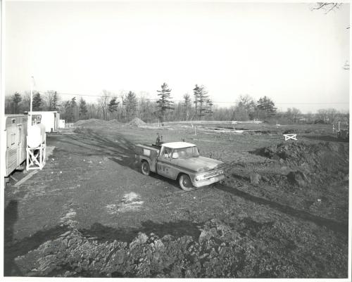 DescriptionBlack and white photograph of a Chevy pickup truck parked on the construction site for the Municipal Building in 1964; on the proper left is the construction site offices; there are various mounds of brit on the site; in the background there is a forested area