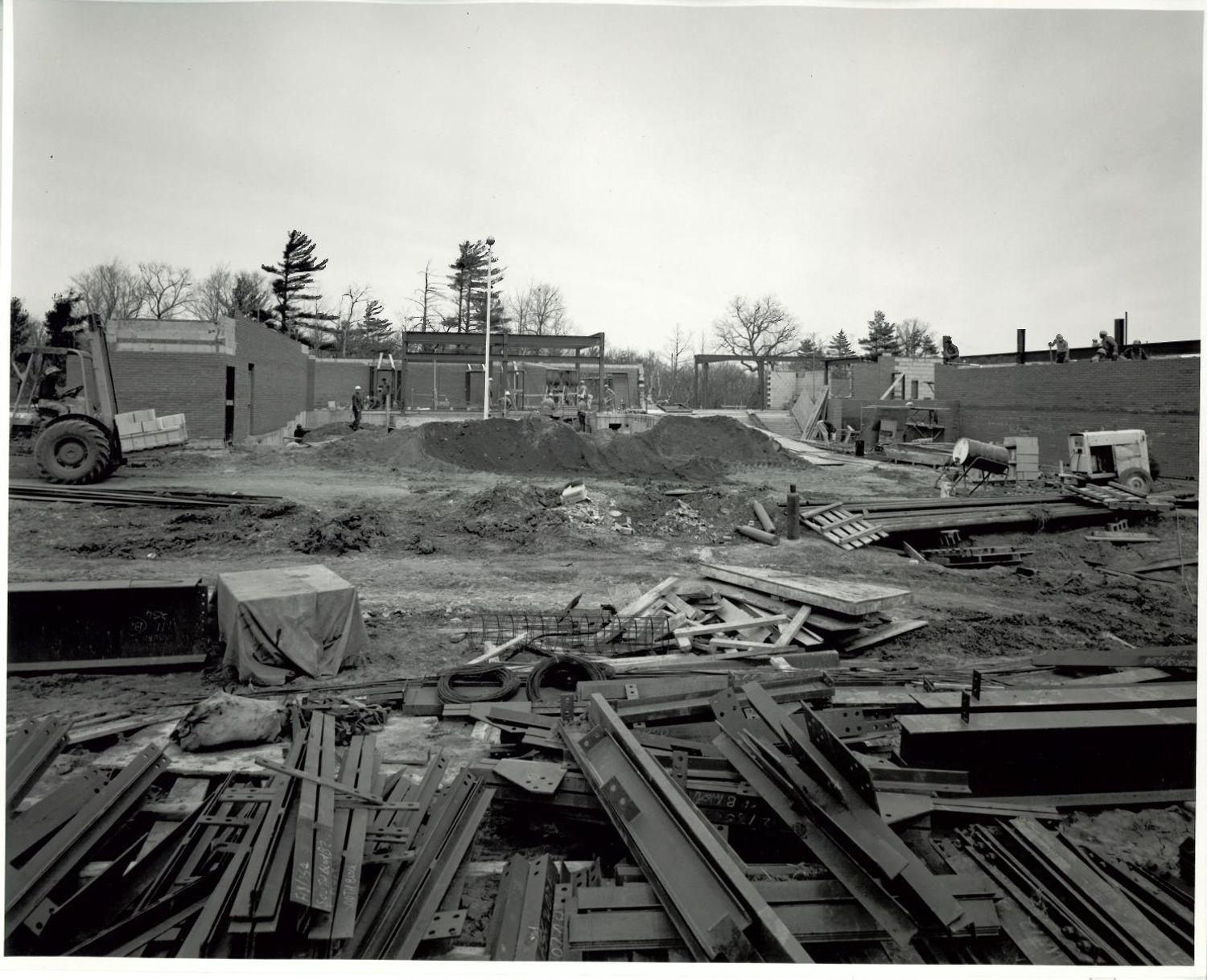 DescriptionBlack and white photograph of the construction of the Municipal Building taken from what would be the front of the building; Steel beams and pieces of steel framework can be seen spread across the front of the photograph along with other building material; Further back in the photograph workers can be seen working on the structure; On the proper right a worker can be seen driving a forklift caring cinderblocks; A tall white flagpole can be seen near the center in front of the structure