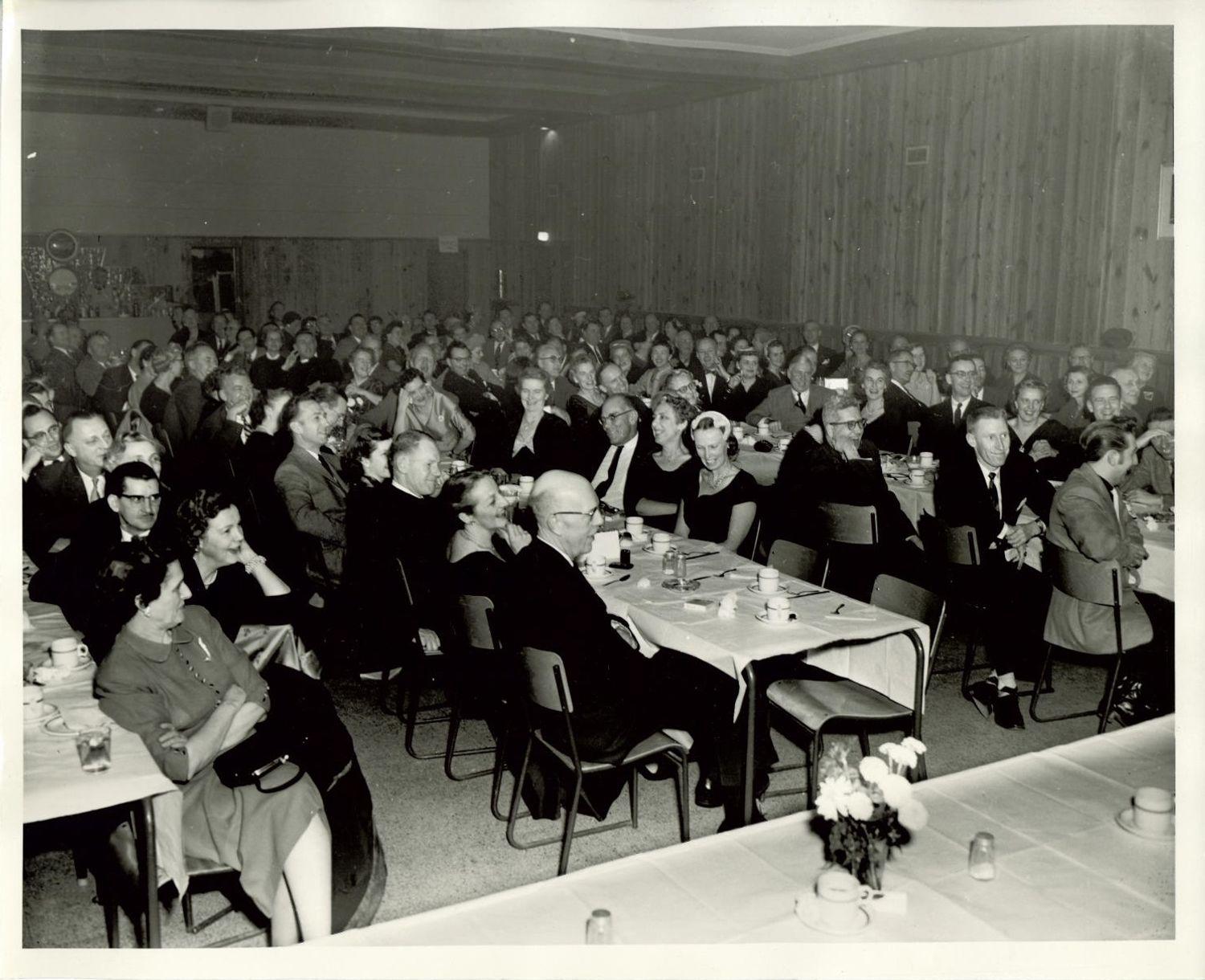 DescriptionBlack and white Photograph of the first Booster Banquet held in the Oakville Arena Pine Room; various people can be seen sitting at rows of tables looking towards the proper left of the photograph; a bar can be seen in the far proper right of the photograph
