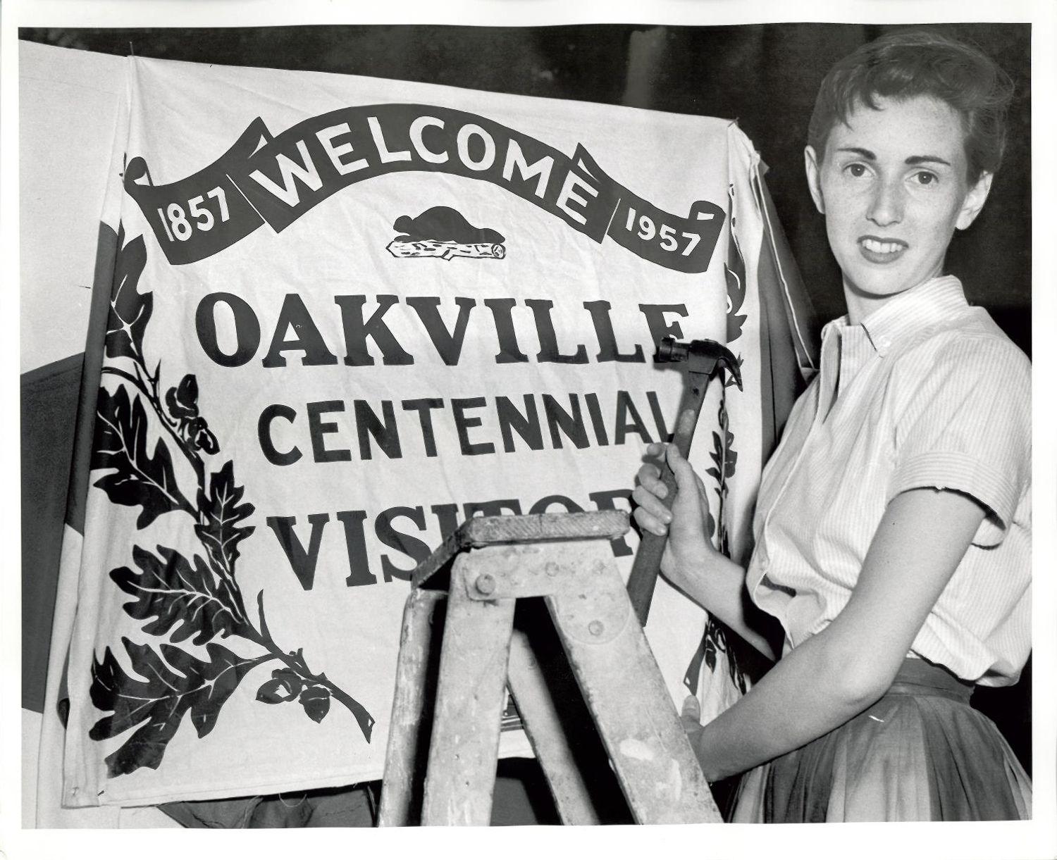 DescriptionBlack and white photograph of a woman on a ladder in front of a centennial banner; the woman is posing an holding a hammer; the banner reads "1857 WELCOME 1957 OAKVILLE CENTENNIAL VISITORS"