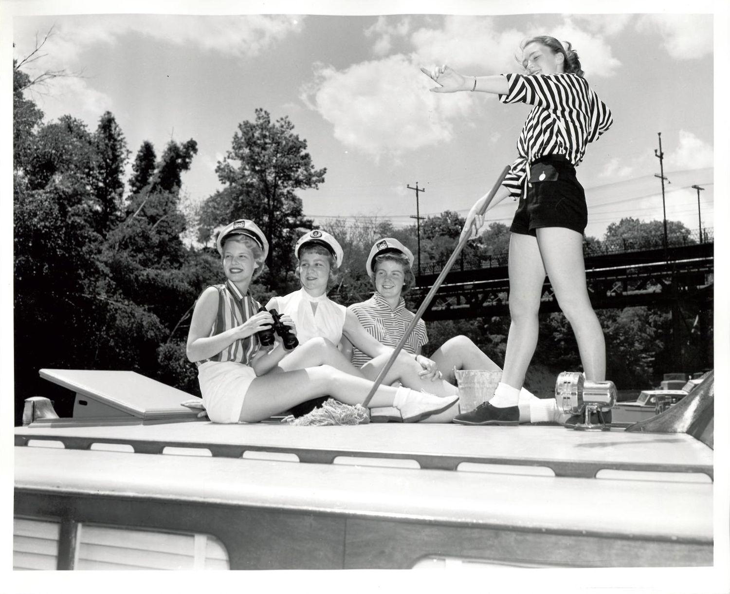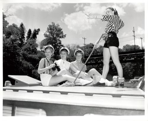 DescriptionBlack and white photograph of four girls on the deck of a boat; One of the girls is standing on the boat holding a mop and pointing; The other three girls are sitting on the deck of the boat looking in the direction of where the one girl is pointing; All three of the girls sitting are wearing captains hats and one is holding a pair of binoculars; In the background is the radial bridge on Sixteen Mile Creek;