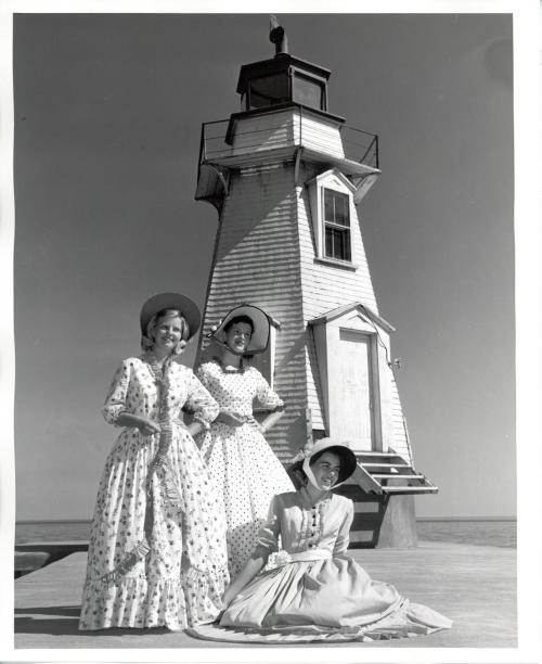 DescriptionBlack and white photograph of three girls in front of the Lighthouse and Oakville harbor; all of the girls are dressed in Victorian costume; two of the girls are standing and one is sitting on the pier; in the background in the Lighthouse and Late Ontario