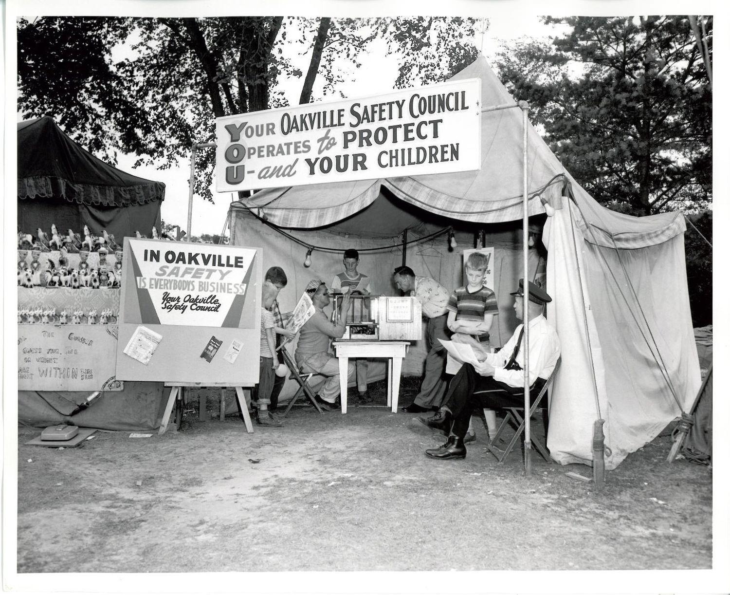 DescriptionBlack and white photograph of the Oakville Safety Council booth at the Centennial Fairgrounds; In the center of the photograph is the booth with people inside the tent where they are providing eye tests; Above the booth there is a sign that reads "YOUR OAKVILLE SAFETY COUNCIL OPERATES to PROTECT U -and YOUR CHILDREN"; There is a second sign on an easel outside the booth that reads "IN OAKVILLE SAFETY IS EVERYBODYS BUSINESS Your Oakville Safety Council"; Members of the public can be seen inside the tent; One person is sitting in a chair getting an eye test done; On the proper right a booth for guessing age and weight can be seen; The sign on the booth reads: FOOL THE GUESSER, GUESS YOUR AGE OR WEIGHT, AGE WITHIN 2 YRS, WEIGHT WITHIN 3 LBS"; There are three rows of various ceramic prizes on the booth for guessing the age and weight