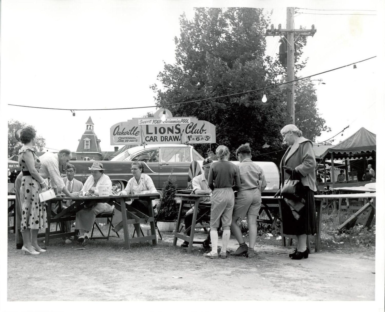 DescriptionBlack and white photograph of the Lions Club booth at the Oakville Centennial Celebrations; The Lion's Club is having a draw for a car; there is a sign on top of the car that reads "Support you swimming pool, Oakville Centennial June 29th - July 6th, Lions Club CAR DRAW! Tickets $1.00 or 6 for $5.00"; The Lions Club has 2 tables in front of the car to sell tickets; There is a big ballot drum behind the table of the proper left; In the background near the proper right is the bell tower of Central School