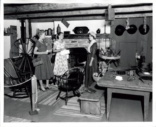 DescriptionBlack and white photograph of the interior of Thomas House; the home was built in 1859 and is set up to reflect that period; three woman can be seen standing in front of the old fireplace; two of the women are conversing with another woman in period costume