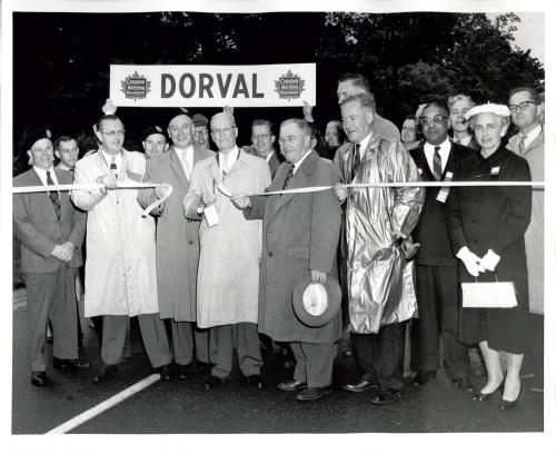 DescriptionBlack and white photograph of the ribbon cutting ceremonies for the Oakville Centennial Celebrations; Hubert Chisholm can be seen standing holding a pair of scissors after cutting the ribbon for the Oakville Centennial Celebrations; To the left of Hubert Chisholm holding part of the ribbon is Mayor Robert Pratt Mayor of Dorval Quebec; Mayor William Anderson on the right of Hubert Chisholm also holding part of the ribbon; Ollie Johnson can be seen standing second from the far right
