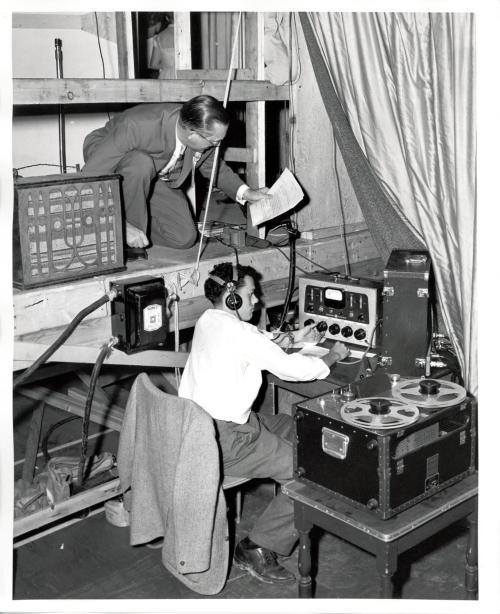 DescriptionBlack and white photograph of Radio Station C.H.W.O. tape recording the Centennial Concert; Photograph is taken behind the stage was installed at the Oakville Club for the Luncheon and Concert; A radio technician can be seen sitting in front of the audio controls while the presenter/announcer is leaning over from the back of the stage towards the technician; Various radio equipment can be seen behind the stage
