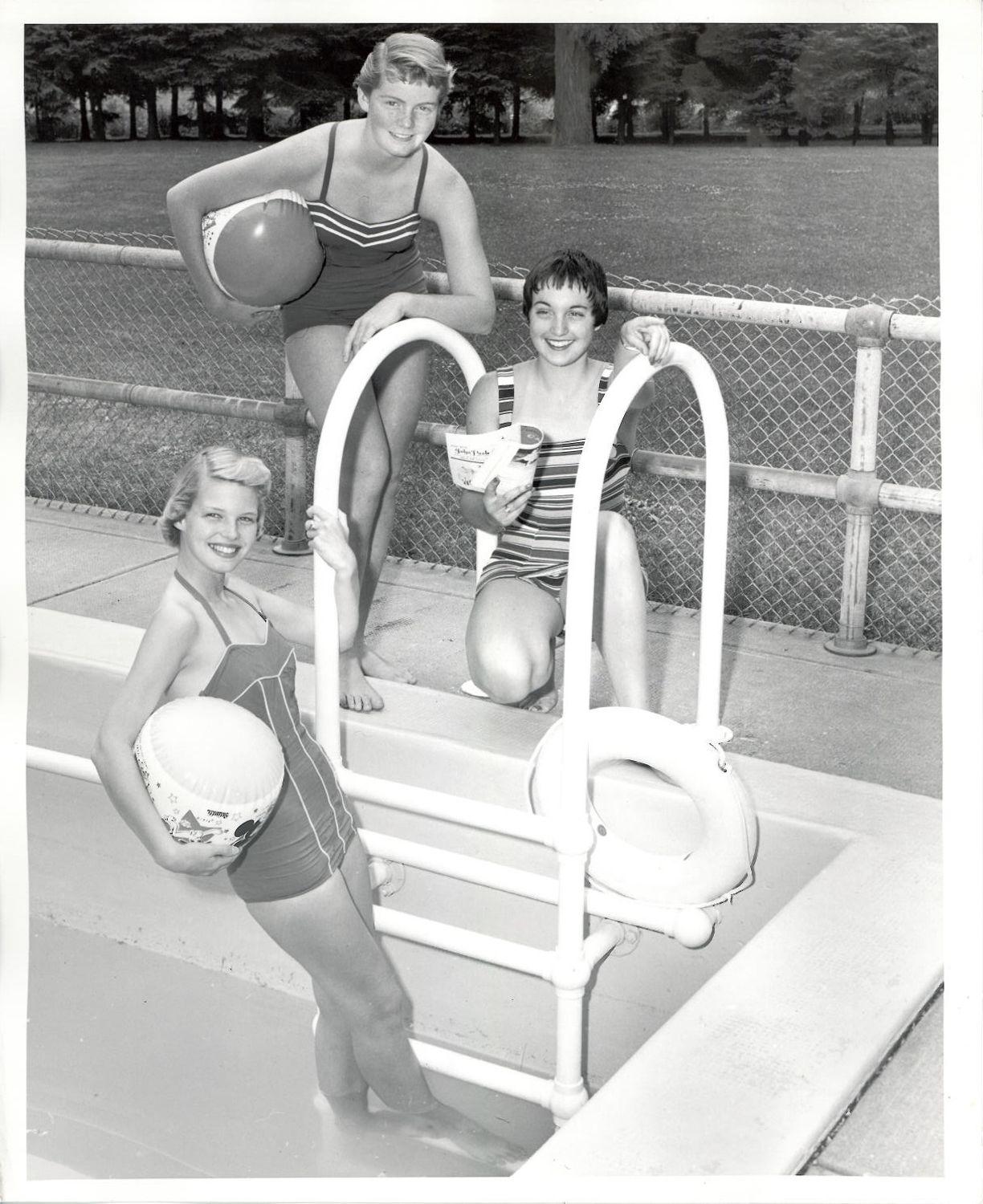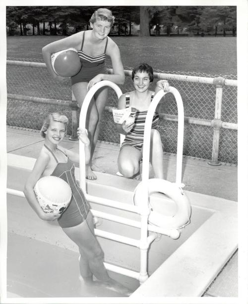 DescriptionBlack and white photograph of three girls at a pool: One of the girls is on the pool ladder ad holding a beach ball; Two of the other girls are on the pool deck; One girl is leaning on the railing of the pool ladder and also holding a beach ball; The other girl is kneeling on the pool deck and is holding a book; All three girls are dressed in swimming attire; In the background is the wire fencing for the pool and a larger grass space; Location of the pool is the old Holyrodd Estate which was owned by a David Knapp from 1955 to 1969