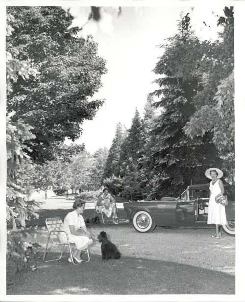 DescriptionBlack and white photograph of three women outside at the Knapp Estate; Two of the women are sitting on folding lawn chairs; Each of the two women sitting have a black poodle sitting with them on the lawn; One woman is standing holding a purse and looks as if she is getting into a convertible car that is parked behind her; In the background are some of the grounds on the estate along with various trees