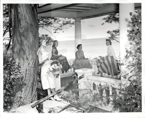 DescriptionBlack and white photograph of four women sitting on the Knapp Estate patio on the waterfront of Lake Ontario; One of the women is standing and leaning on a large tree while holding a basket full of various flowers; Three of the other women and sitting on the patio; The patio has four colonial columns supporting the roof;