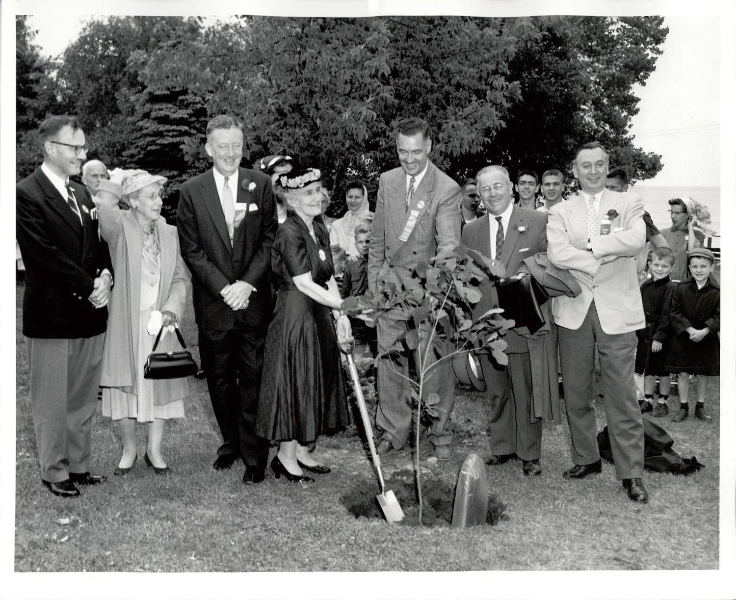DescriptionBlack and white photograph of the Centennial Oak tree planting and dignitaries; Mayor William Anderson can be seen second from the right; Mayor Robert Pratt of Dorval can be seen on the far right; Tree planting took place at Lakeside Park