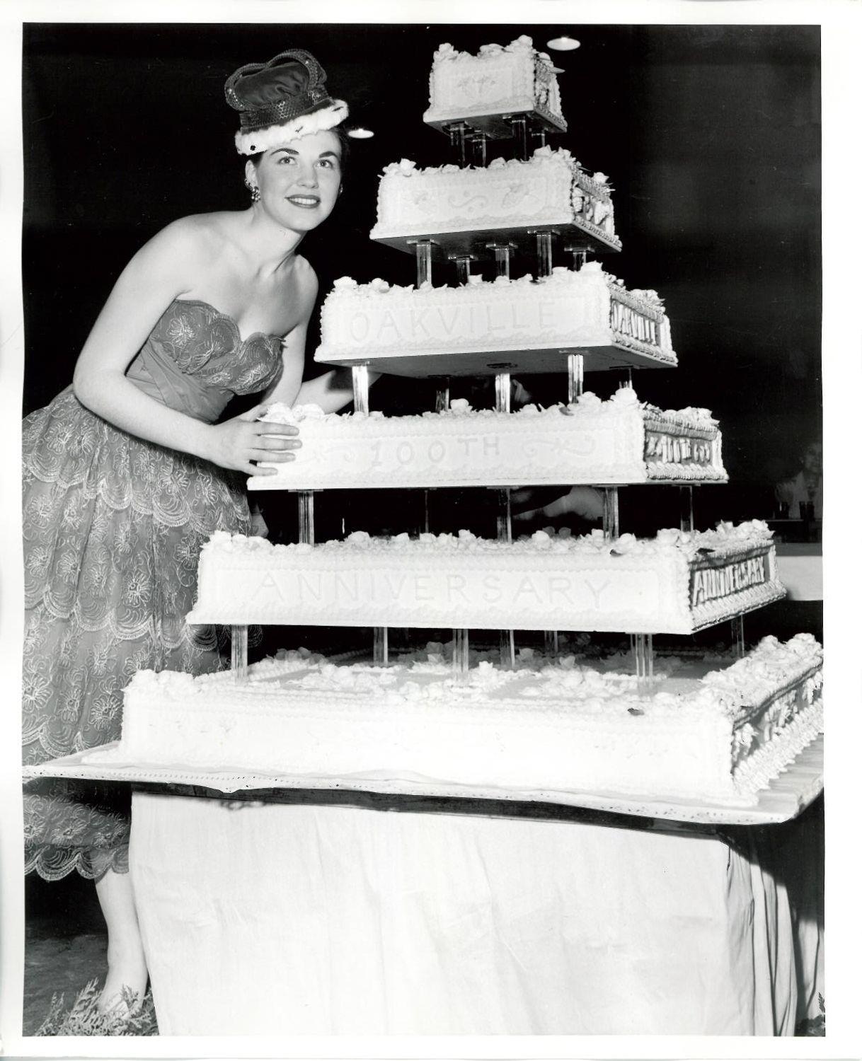 DescriptionBlack and white photograph of Miss Oakville Centennial leaning up against the six tier Centennial Cake; The cake has "OAKVILLE 100TH" piped on in white icing; Miss Oakville Centennial is wearing her crown