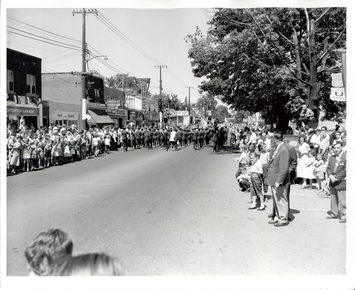 DescriptionBlack and white photograph of the Dominion Day Parade on Colborne Street East of Dunn Street; a marching band is seen walking east along the parade route; Spectators can be seen on both sides of Colborne Street watching the Parade