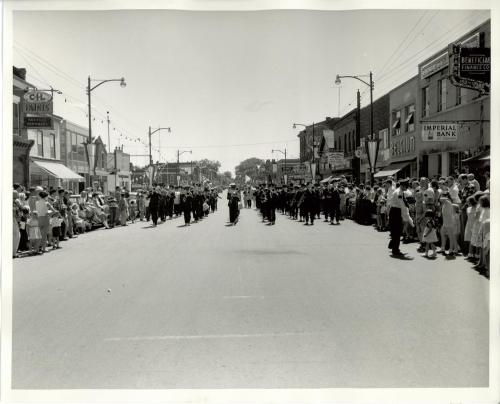 DescriptionBlack and white photograph of The Dominion Day Parade on Colborne Street facing West from Dunn Street; A marching band can be seen marching east on Colborne Street; Spectators can be seen on both side of Colborne Street watching the parade