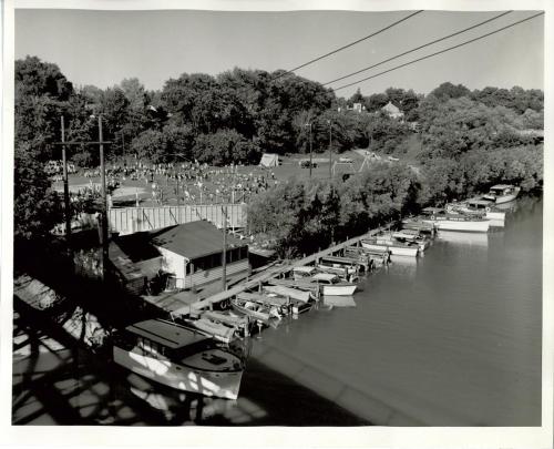 DescriptionBlack and white photograph of the Majorettes on display at Busby Park; the photograph is taken from the west side of Radial Bridge looking onto the park; various boats can be seen docked along Sixteen Mile Creek; The Park is surrounded partially by various trees