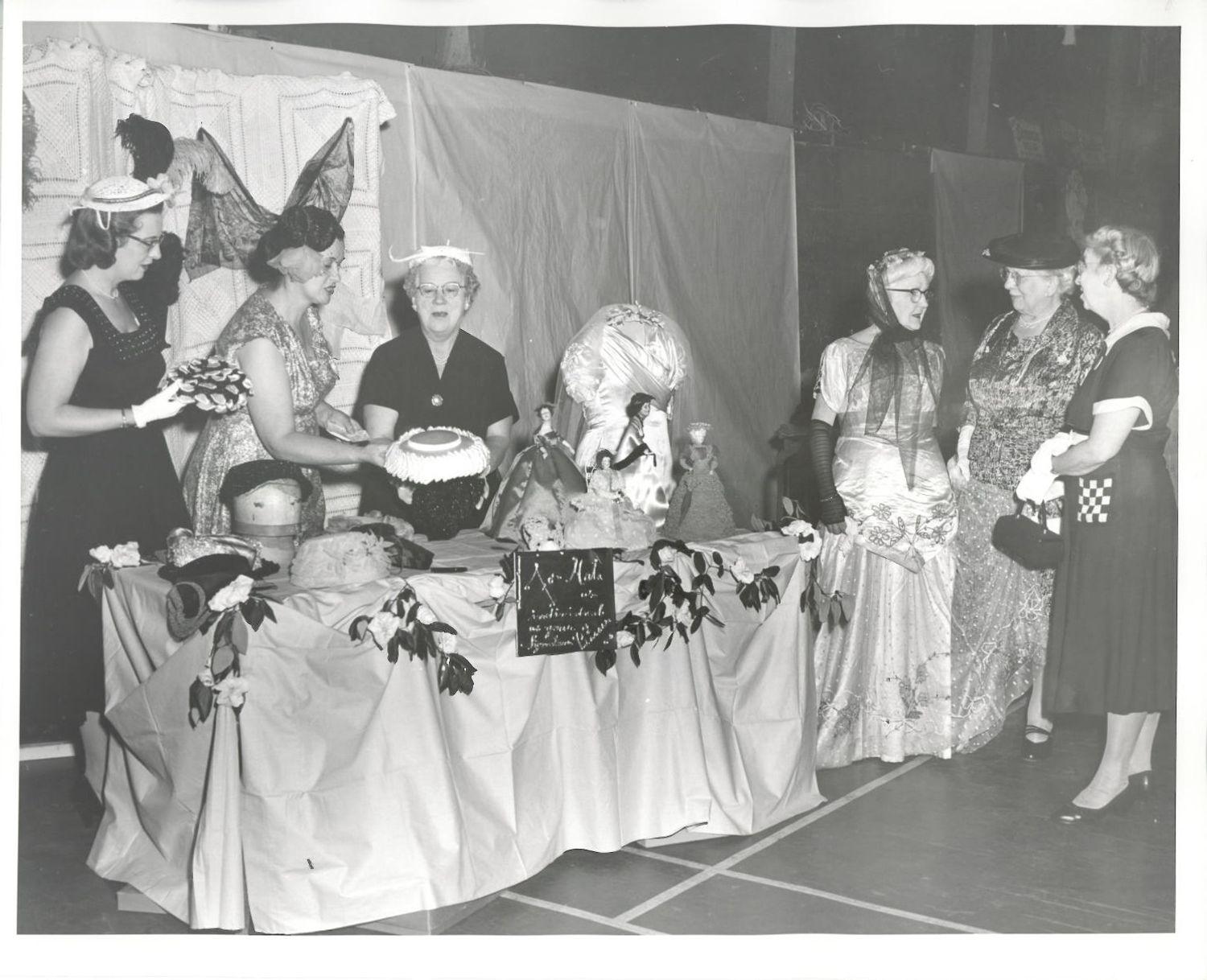 DescriptionBlack and white photograph of the Home Demonstrations at the Oakville Club in the badminton courts; Bessie Irwin's booth can be seen in this photograph; There are a variety of different hats on display as well as four dolls; Three women can be seen standing behind the booth; On the proper left an older woman can be seen dressing in a Victorian dress talking with two other women