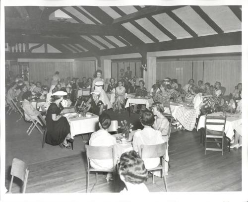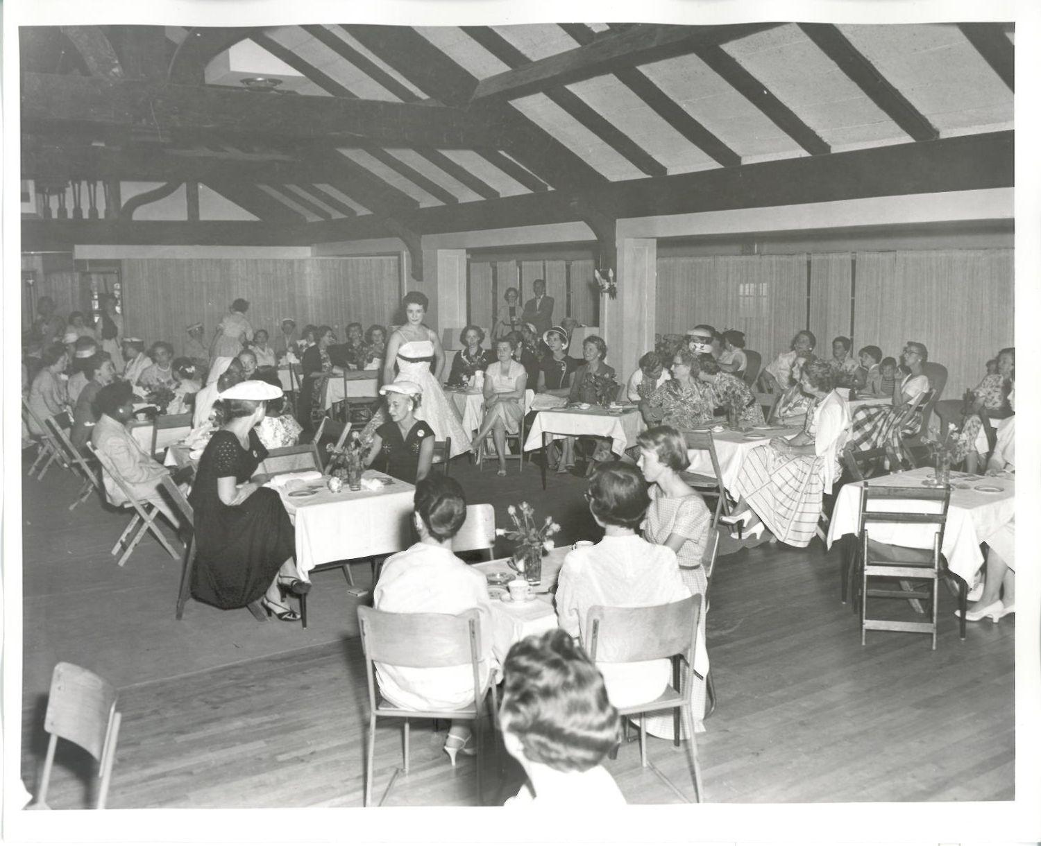DescriptionBlack and white photograph of the Fashion Show at the Oakville Club; Woman can be seen sitting at various tables enjoying the Fashion Show; a Model wearing a white dress can be seen walking between the tables