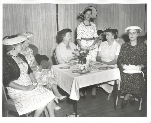 DescriptionBlack and white photograph of from the Fashion show at the Oakville Club; a group of women can be seen sitting at table; a young lady dressed in Victorian costume is standing serving the table with a plate of food
