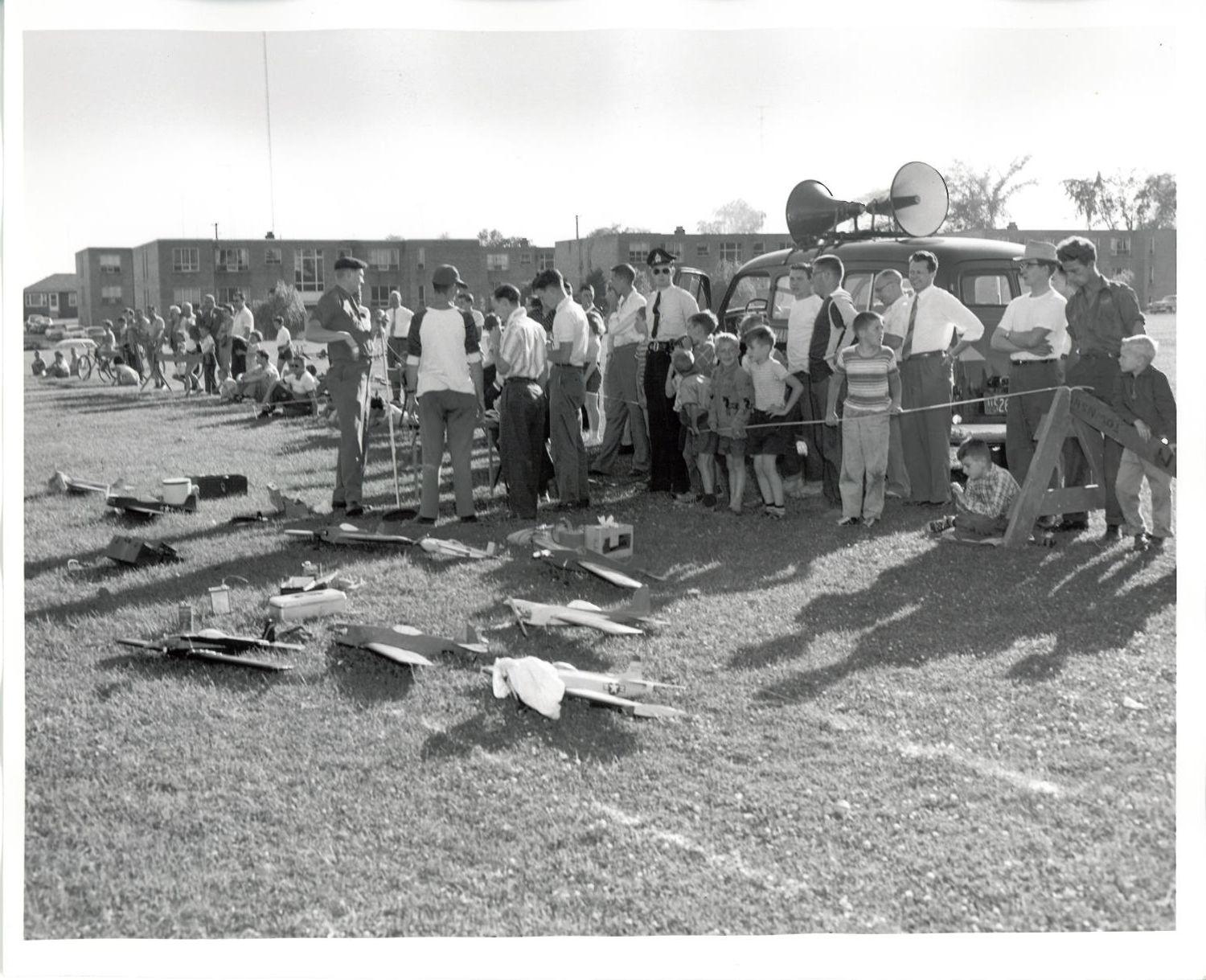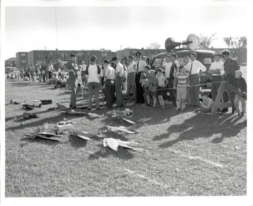 DescriptionBlack and white photograph of the Flying Model Demonstration at Trafalgar Park; A group of model planes can be seen on the field; A row of spectators are standing along the roped off area of the field; A vehicle with two speakers can be seen parked behind the row of spectators; There is a small group of model plane operators standing around a small table in the center; The apartment buildings on Felan Avenue can be seen in the background