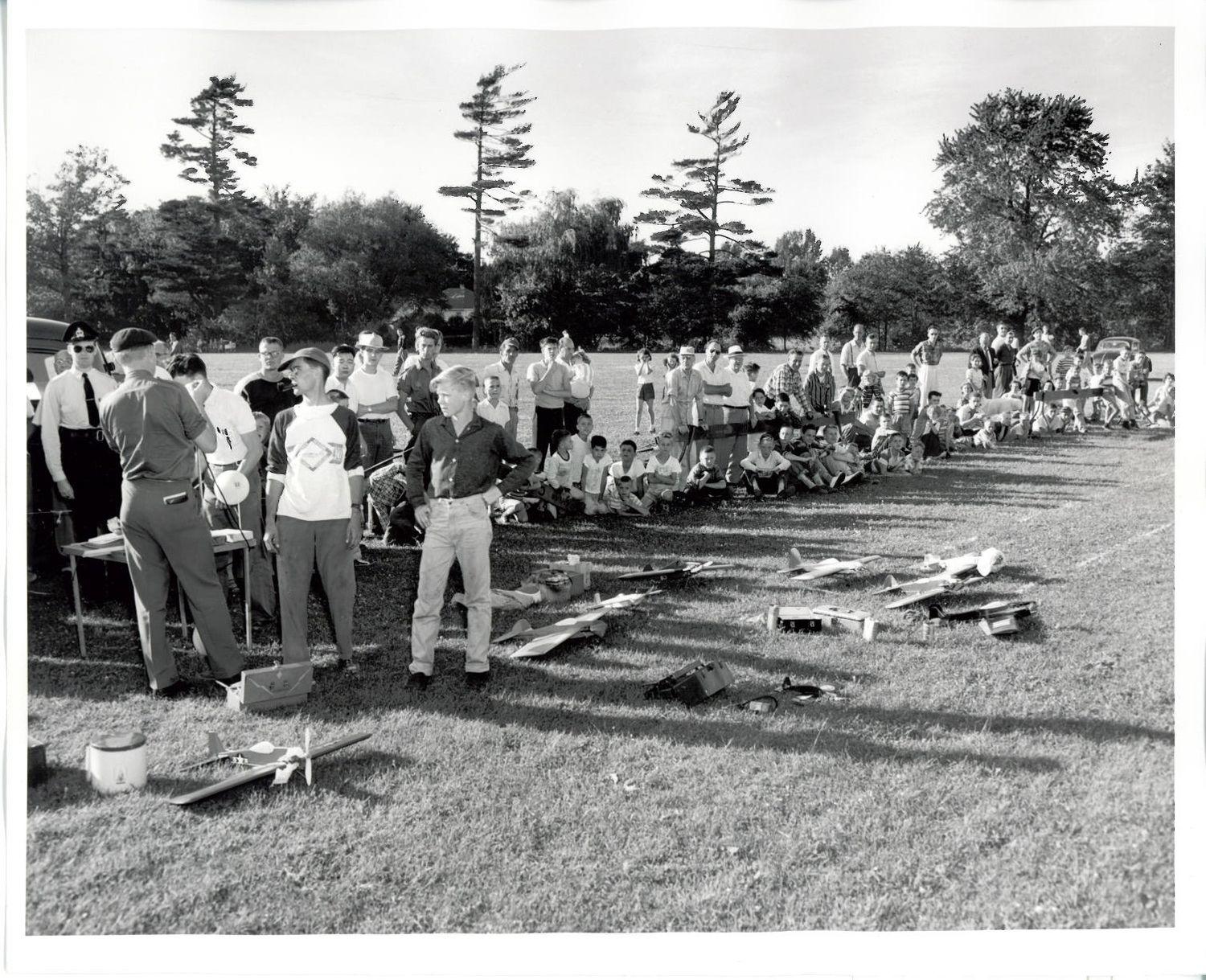 DescriptionBlack and white photograph of the Model Flying Demonstration at Trafalgar Park; a crowd of spectators can be seen standing along the field to watch the model flying; on the proper right is a group of model flying operators surrounding a small table; there are a group of model planes on the field; in the background are various trees