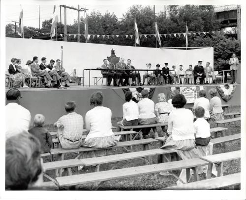 DescriptionBlack and white photograph of the Installation of Children's Council at Busby Park; On the stage is Mayor William Anderson sitting in the Mayor's chair at a large table along with two other men sitting at either side of him; On the left and right of the large table there are a group of people sitting on the stage; The children in the stage are part of the Children's Town Council; Spectators can be seen sitting on benches in from the stage watching Mayor William Anderson speaking; In the distance is the Radial Bridge