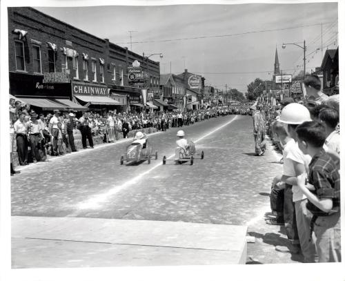 DescriptionBlack and white photograph of the Junior Hot Rod Derby on Colborne Street; Two Hot Rods can be seen racing down the street from the ramp on Colborne Street; There are several spectators watching the race on either side of the street; The steeple for Knox Church and be seen in the far distance on the proper left