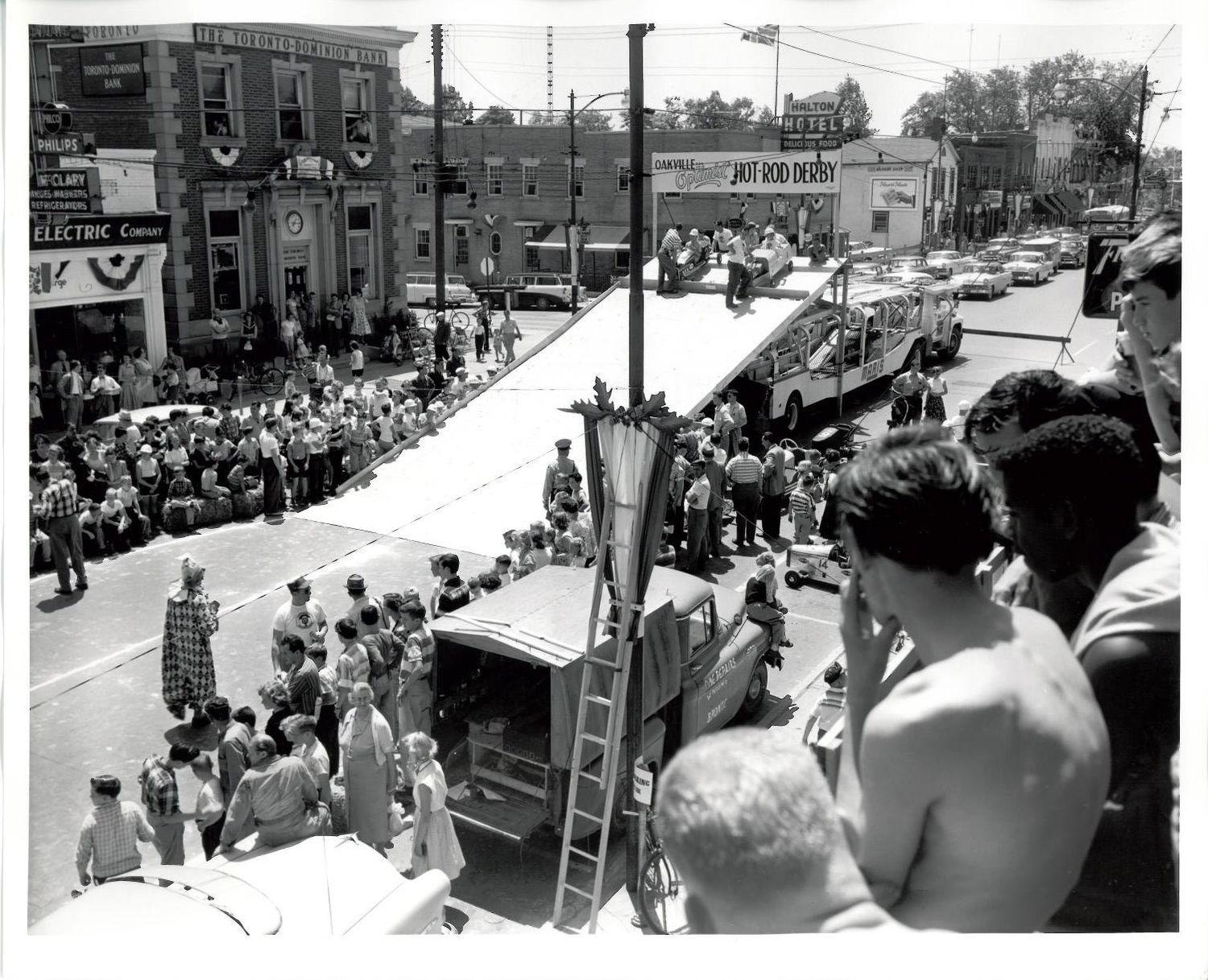 DescriptionBlack and white photograph of the Junior Hot Rod Derby on Colborne Street; The ramp for the derby can be seen at the intersection of Colborne Street and Thomas Street; Above the ramp is a sign that reads " OAKVILLE Optimist HOT-ROD DERBY"; On the ramp are two Hot Rod's getting ready to race; There are numerous spectators on either side of the street and on the roof tops watching the race; A person dressed up as a clown can be seen on Colborne Street