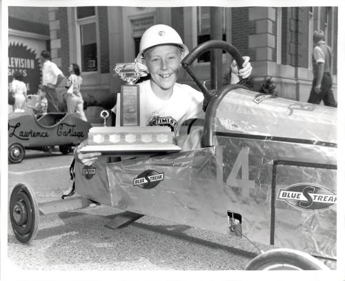 DescriptionBlack and white photograph of the Junior Hot Rod Winner; a young boy can be seen sitting in his Hot Rod called "Blue Streak" number 14 holding his Hot Rod Trophy on Colborne Street