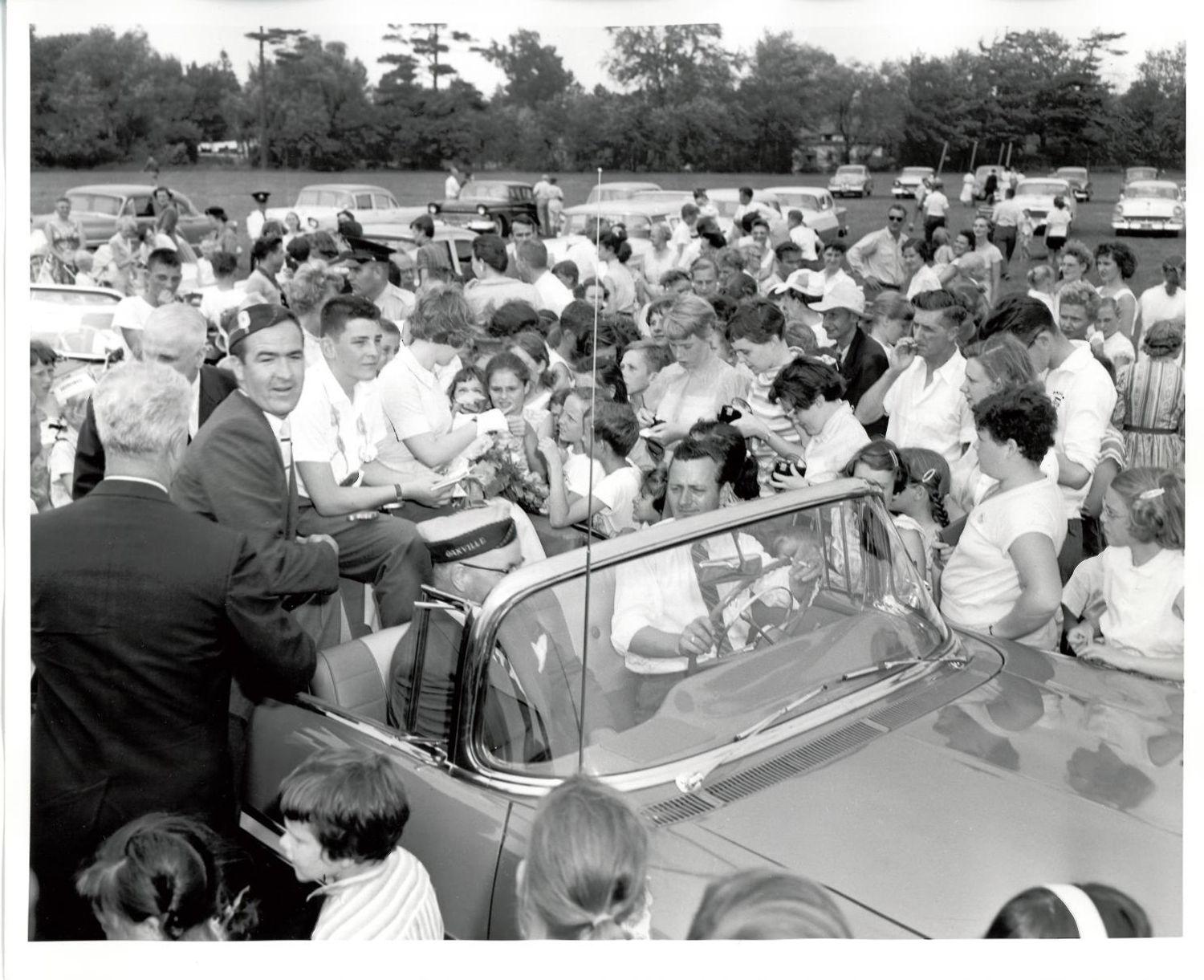 DescriptionBlack and white photograph of Marilyn Bell giving autographs at the Turning of Sod for the Lion's Club Swimming Pool; Marilyn Bell is sitting on the back of a Pontiac Laurentian convertible surrounded by a crowd of people and young children wanting autographs at Trafalgar Park