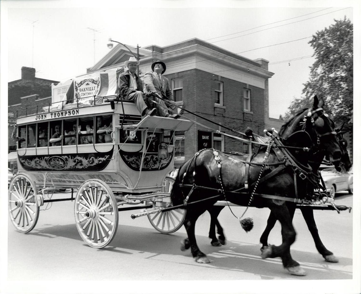DescriptionBlack and white photograph of a horse drawn stage coach in the Old Timers Parade on Colborne Street; Sitting next to the driver of the stage coach is Mayor William Anderson; The coach is being pulled by two horses heading east on Colborne Street; Inside the coach are young children; The coach is at the intersection of Colborne Street and Thomas Street;