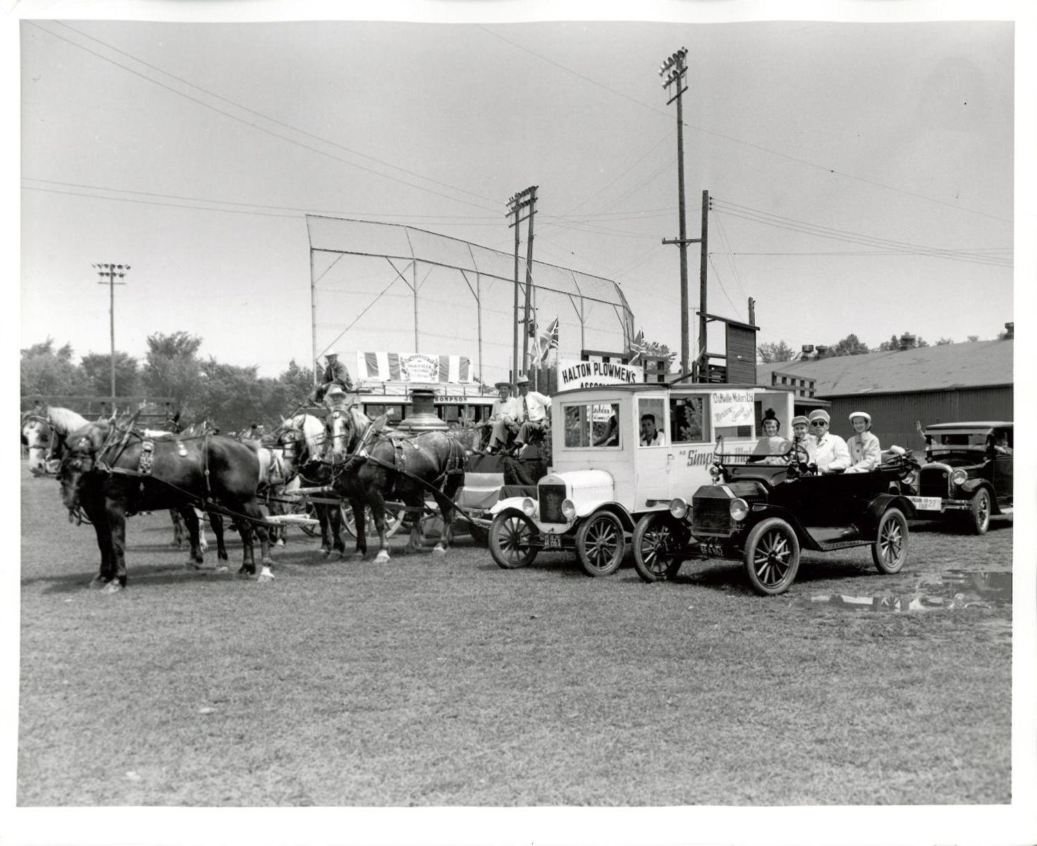 DescriptionBlack and white photograph of two vehicles, a horse drawn Fire Engine, a horse drawn Stage Coach and horse drawn wagon at Wallace Park; Two older vehicles are also parked beside the horses; the baseball diamond can be seen in the background at the park