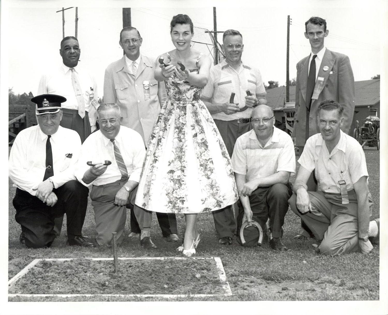 DescriptionBlack and white photograph of a group of people at the Mayor's Horseshoe Pitching Contest at Wallace Park; Miss Oakville Centennial can be seen standing center holding a horseshoe getting ready to pitch it; Mayor William Anderson can be seen kneeling to the left of Miss Oakville also holding a horseshoe; The group of people are all in front of a horseshoe court