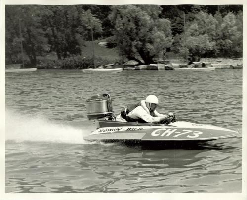 DescriptionBlack and white photograph of a single boat in action at the Hydroplane regatta; a man can be seen driving a small hydroplane boat over a body of water; the boat has "RUIN-WILD CH-73" on the side of the boat