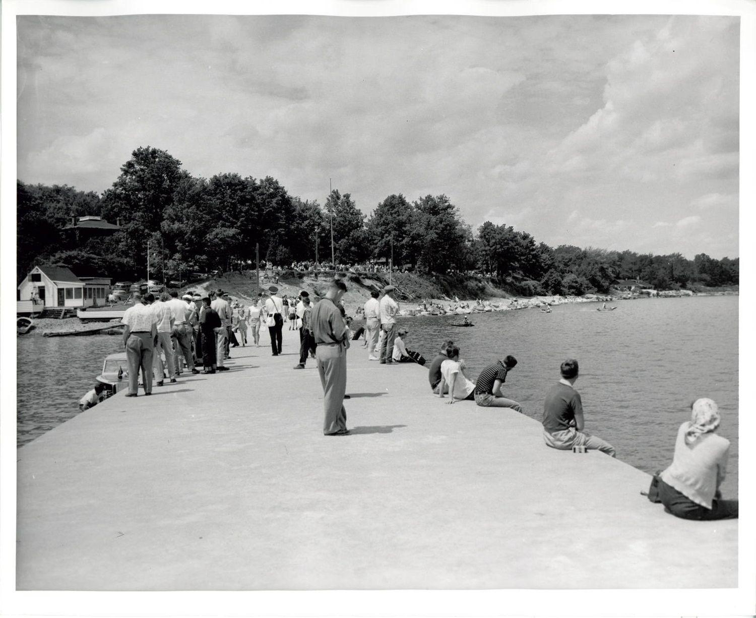 DescriptionBlack and white photograph of spectators watching the Hydroplane Regatta from the Oakville Pier on Lake Ontario and Sixteen Mile Creek; three hydroplane boats can be seen out on Lake Ontario on the right