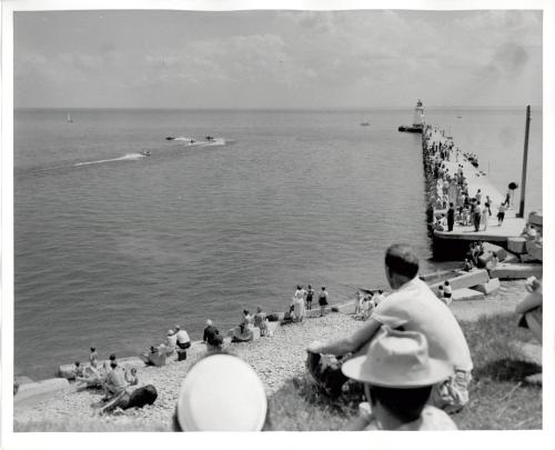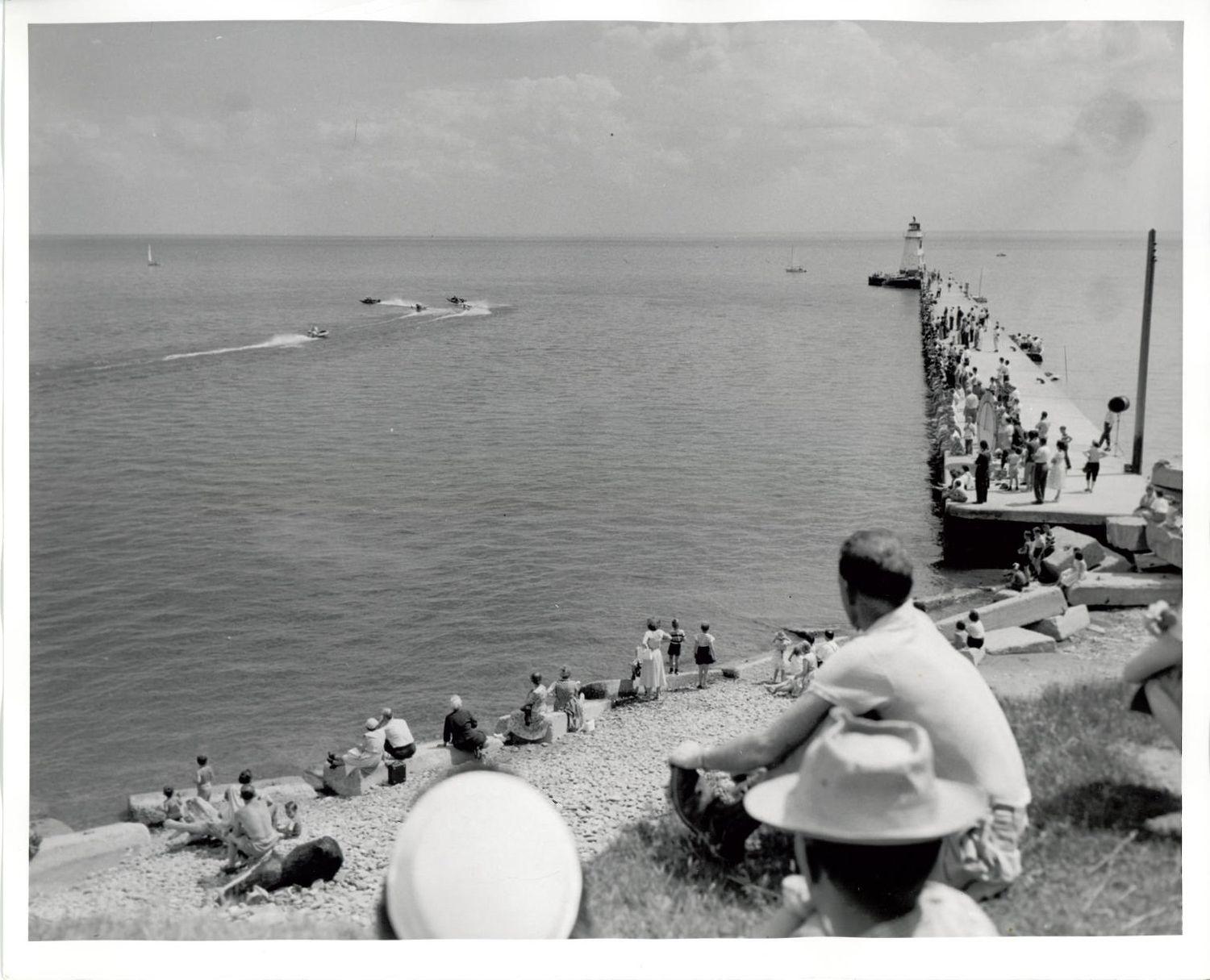 DescriptionBlack and white photograph of spectators watching the Hydroplane Regatta on she shoreline at Lakeside Park and the Pier from Oakville Harbour; A large group of people can be seen on the shoreline and on the Oakville Pier; The Lighthouse can be seen in the distance on the end of the Pier; Hydroplane racers can be seen out on Lake Ontario along with a few sailboats