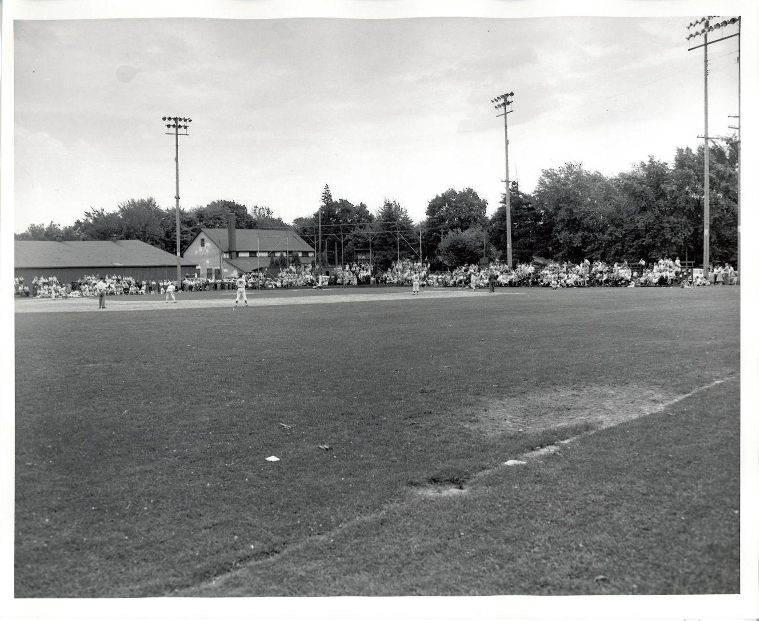 DescriptionBlack and white photograph of the Old Timer's Ball Game at Wallace Park; in center is the baseball diamond in the Park; Players can be seen on the pitch playing; Spectators can be seen sitting on bleachers watching the game