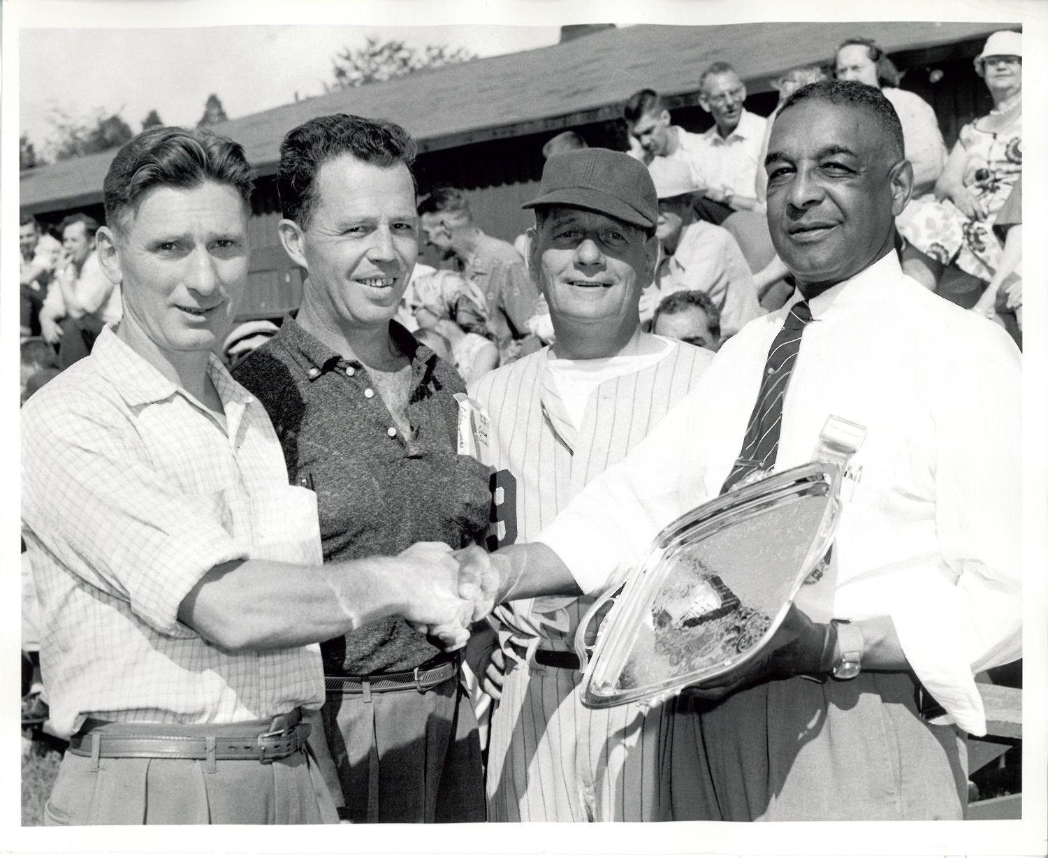 DescriptionBlack and white photograph of Ollie Johnson (R) presenting an award with three men at Wallace Park; Ollie Johnson is shaking the hands with one of the gentlemen; Man in the center is wearing a baseball uniform; behind the men are people sitting in the bleachers at the baseball diamond