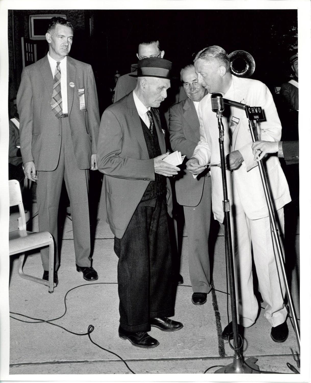 DescriptionBlack and white photograph of the Special Presentation of the "Oldest Man" to former Oakville Mayor John Moat; John Moat is standing center wearing a hat; Behind John Moat is Mayor William Anderson; Herb Merry is standing on the far left;