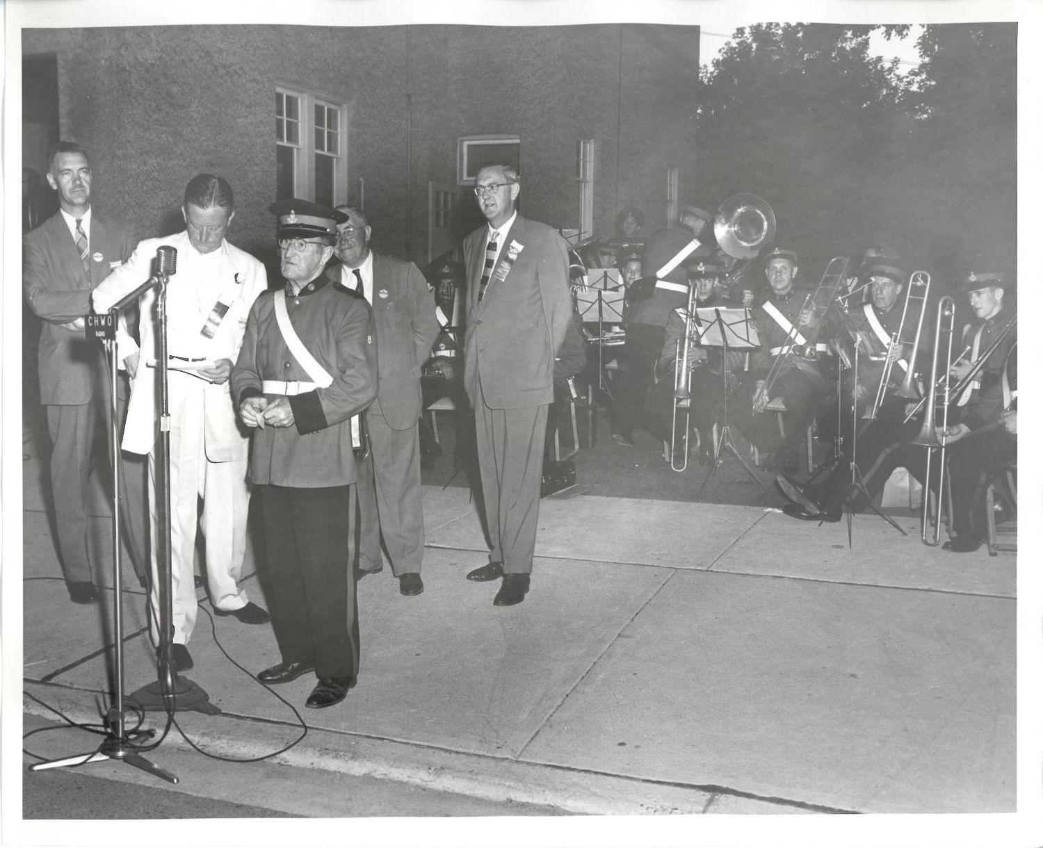 DescriptionBlack and white photograph of the special presentation of the Bandsman; from left to right Herb Merry, Jim Black, Bandsman, Mayor William Anderson, Howard Caine