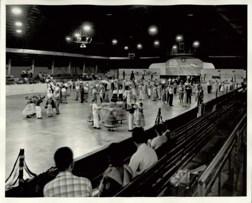 DescriptionBlack and white photograph of the Square Dance Festival at the Oakville Arena that was part of the Oakville Centennial Celebrations; Photograph is an overall shot of inside the Arena; Square dancers can be seen in the rink area dancing; A few spectators can be seen sitting in the stands watching the dancers; The bandstand stage can be seen in the far side of the arena