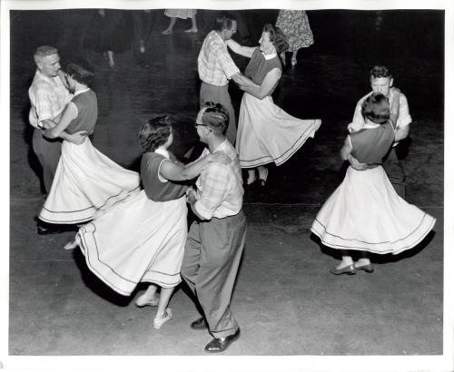 DescriptionBlack and white photograph of the Square Dance Festival inside the Oakville Arena; couples can be seen square dancing; all of the dancers are wearing matching outfits