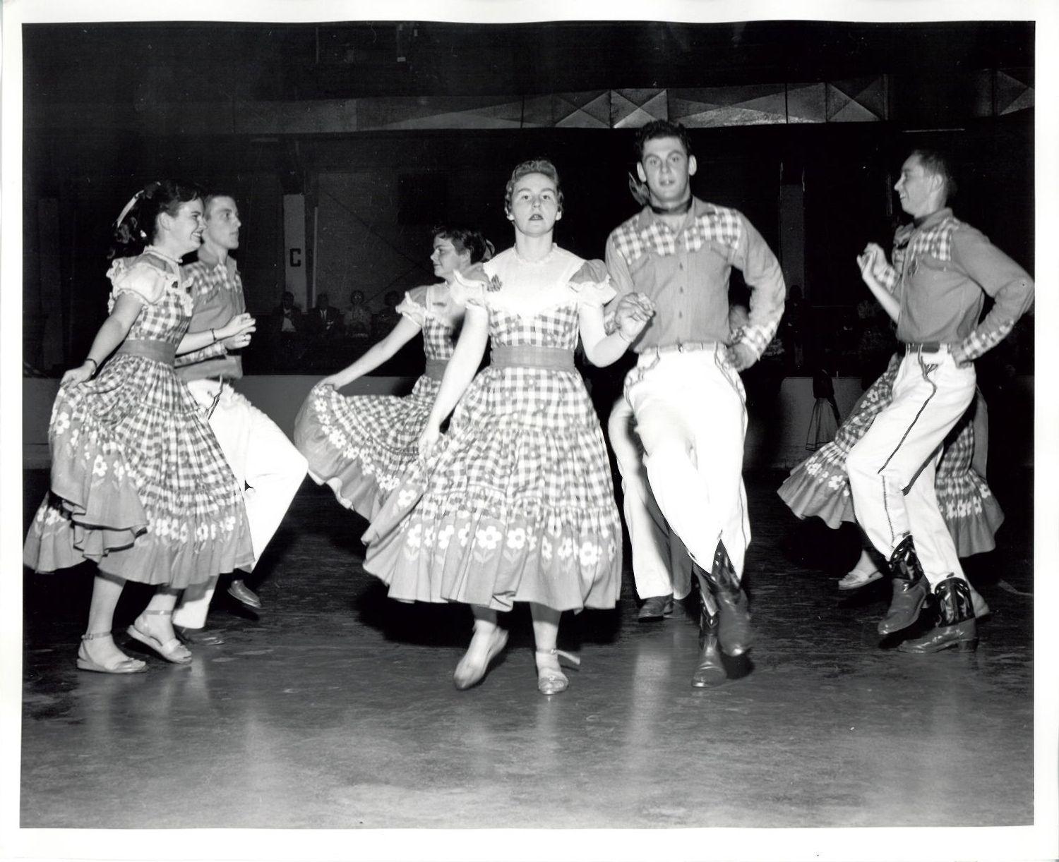 DescriptionBlack and white photograph of some of the dancers preforming at the Square Dance Festival inside Oakville Arena; all of the dancers are wearing matching outfits