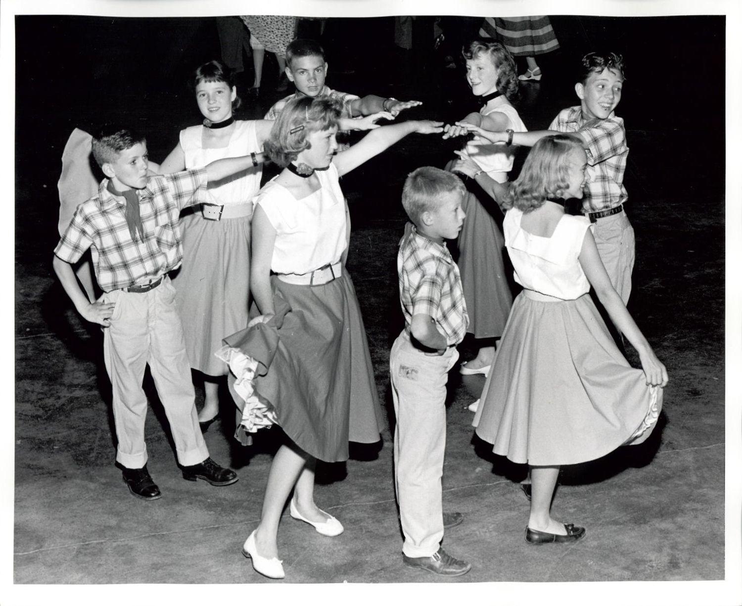 DescriptionBlack and white photograph of a group of children preforming at the Square Dance Festival inside the Oakville Arena; all of the young children are in a circle and wearing matching outfits
